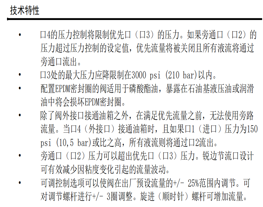 带外控口,旁通/节流,固定节流口,优先流量控制阀接受口1的输入流量,并用来满足口3的优先流量。如果输入流量超出优先 流量需求,多余的流量经口2旁通流出。旁通流量可用于次级油路。外控口(口4)允许对此类阀远程控制。